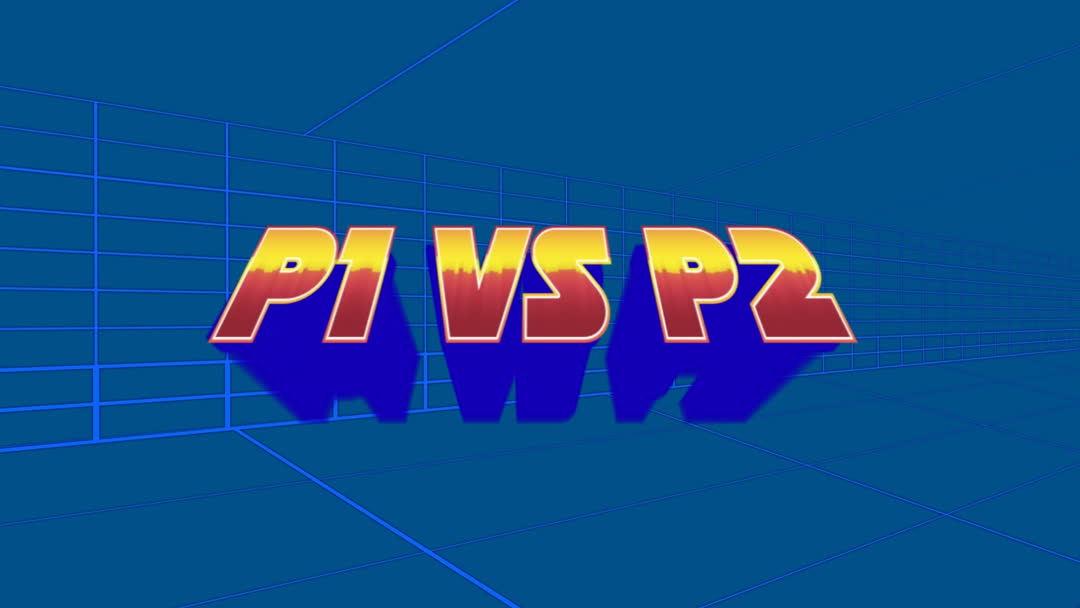 Retro game style animation depicting the classic P1 vs P2 battle setup in a digital blue space with grid lines, evoking nostalgia for vintage video games. Perfect for use in gaming events, promotional materials, or creative projects that highlight past gaming aesthetics.