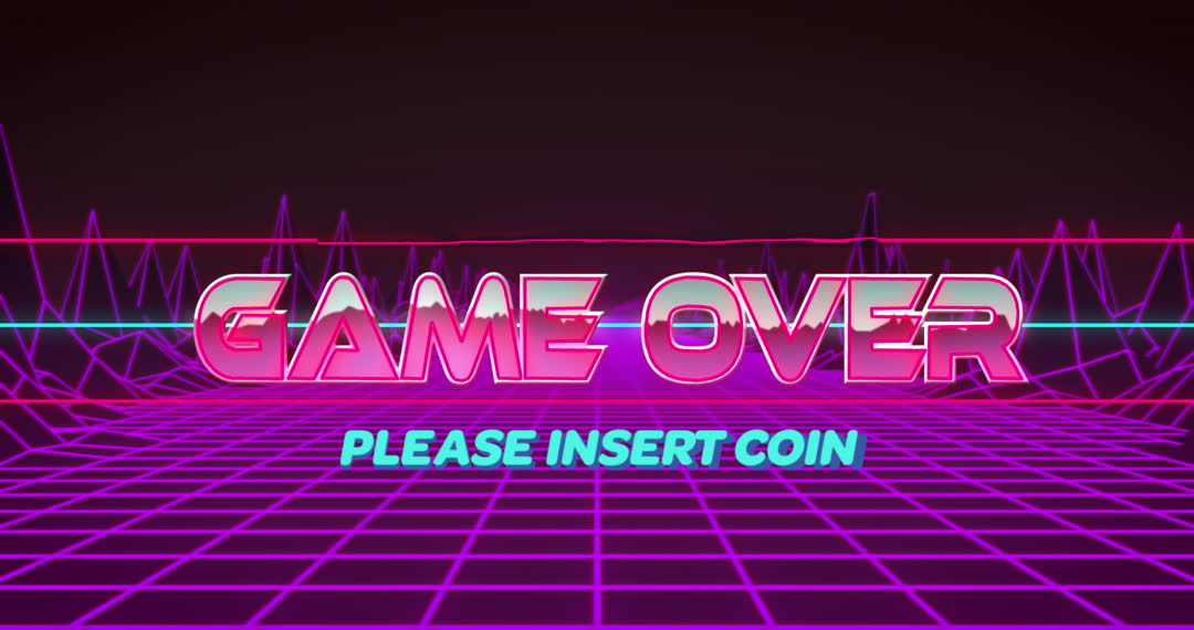 Depicting a classic 'Game Over, Please Insert Coin' message, this graphic bursts with vibrant neon colors reminiscent of retro arcade games. The digital grid and glowing text transport viewers back to the 80s gaming era while evoking a modern, futuristic feel. Ideal for use in any gaming content, vintage digital art presentations, nostalgic movie compilations, or to evoke a retro futuristic aesthetic in creative projects.