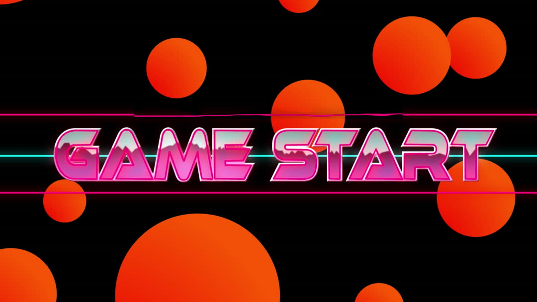 Features a dynamic 'Game Start' text in neon lettering with a retro aesthetic. Perfect for video game intros, retro-themed presentations, or digital media projects. The vibrant orange circles add a pop of color against a black background, enhancing the nostalgic 80s style. Ideal for use in gaming videos or modern digital content with an 80s twist.