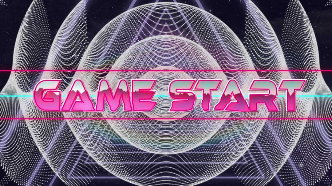 Vibrant retro-styled screen prominently displays 'Game Start' with a futuristic neon tunnel and abstract patterns. Suitable for content related to video game launches, cyberpunk-themed media, digital events, or retro gaming collections. Perfect for web designers and gaming blogs looking to capture a classic gaming atmosphere.