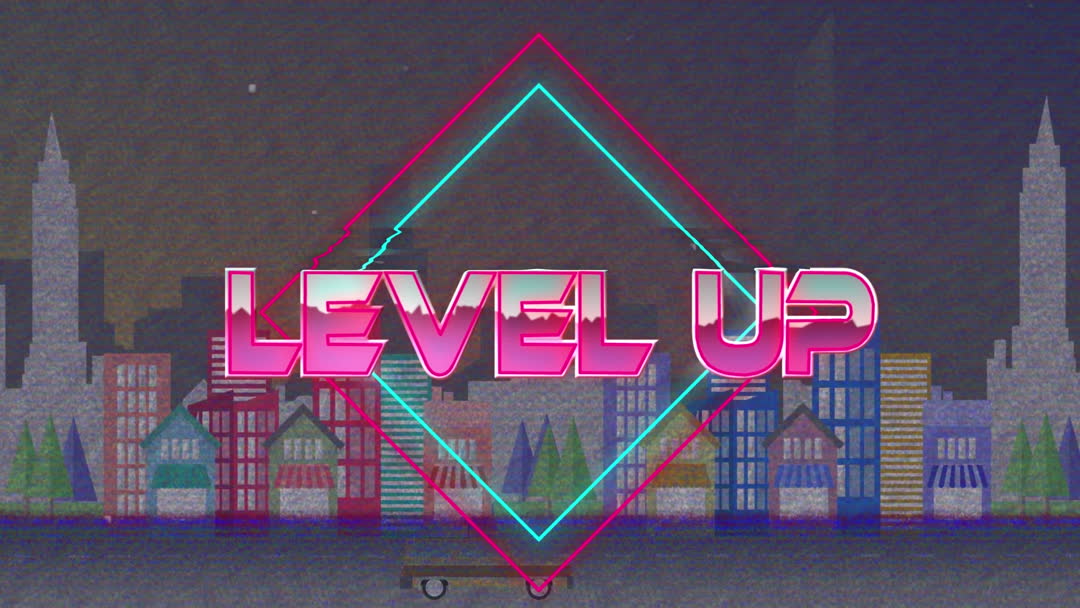 This digital artwork features a vintage gaming aesthetic with a neon 'Level Up' sign over a cityscape. Designed with vivid neon colors and geometric patterns, it evokes an 80s retro video game theme. Perfect for use in projects related to gaming, digital media promotions, and social media banners.
