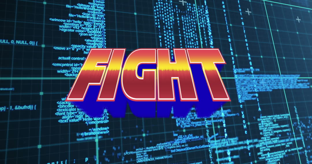 A bright retro gaming style 'FIGHT' text set against a backdrop of digital code and data processing visuals. The navy background emphasizes the neon font, calling back to classic arcade games. Suitable for projects relating to game design, technology themes, retro gaming collections, or any cyber-punk styled concept.
