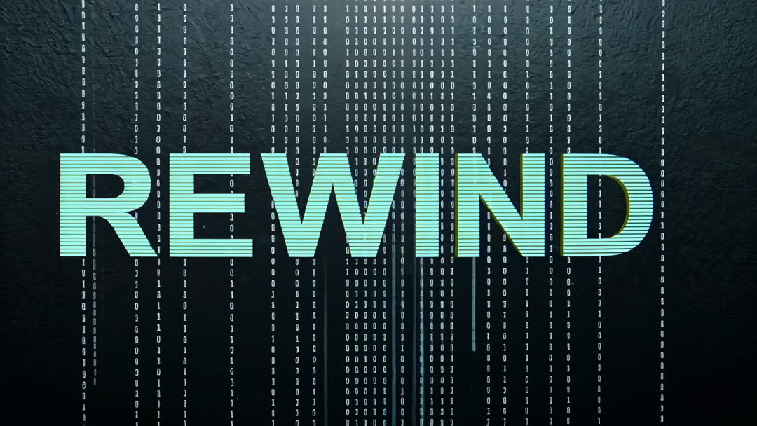 AI Generated Image. Sequence featuring bold cyan REWIND title sliding into center over textured dark panel, vertical streams of binary digits cascading downward. Retro glitch and neon scanline effects flickering across letters, revealing text with digital tear transitions and subtle noise grain. Composition offering strong center focus and high contrast for easy blending with overlays and lower thirds. Ideal for tech promo, cyber security video, music visualizer, streaming intro, social media short, tutorial opener. Use as looping background, full-screen title sequence, or punchy transition between scenes. Pair with electronic soundtrack and glitch SFX to amplify mood. Customization options including color grading, playback speed, looping, masking for branding, and optional alpha channel for overlay. Deliverable suggestions: 4K UHD, 30/60fps for crisp playback.