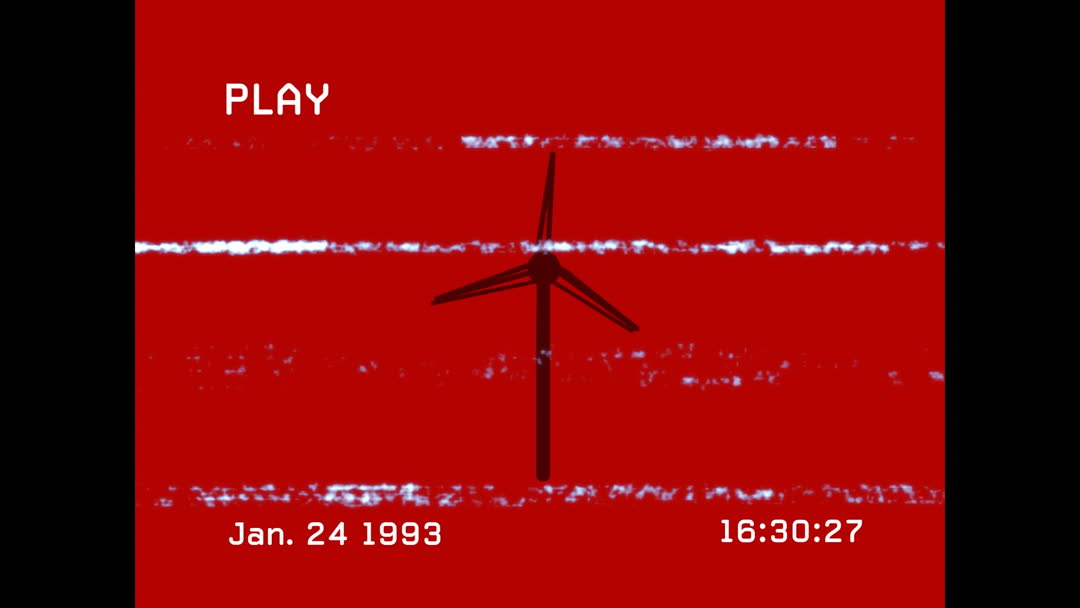 Animated depiction with a vintage video cassette overlay features a wind turbine icon and disrupted glitch effects against a bold red background. The nostalgic date and time stamp evoke early 1990s aesthetics, portraying a connection between past technology and contemporary sustainable solutions. Ideal for content related to sustainable energy, retro technology themes, environmental campaigns, or digital design projects focusing on multimedia trends from the 90s.