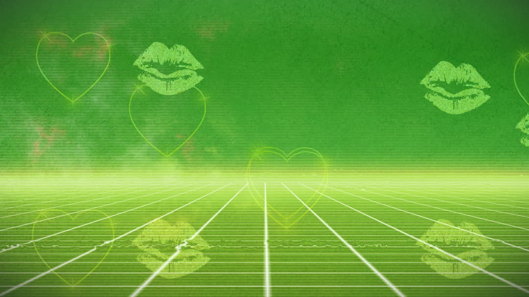 Retro Green Digital Grid with Floating Hearts and Lip Icons Video