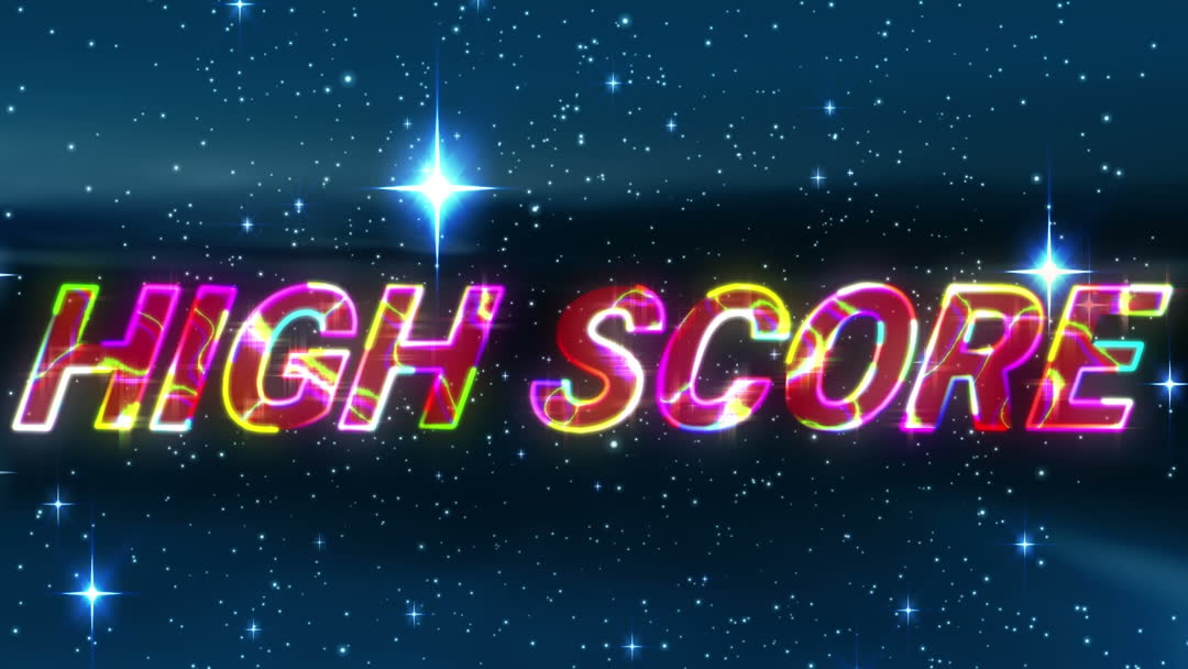 Retro-themed animation displaying 'high score' in colorful, neon text set against a starry night sky. Incorporates striking contrasts and vivid hues common in video games. Ideal for use in digital marketing campaigns for gaming brands and apps, tutorial videos, or retro-themed entertainment content related to games.