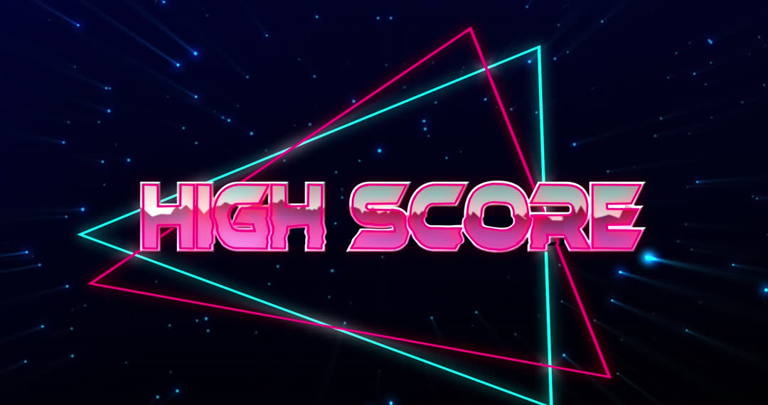 Animated high score graphic in retro 80s style with vibrant neon design and geometric shapes perfect for gaming platforms. Useful for video game clips, arcade promotions, nostalgic or futuristic themes for creating engaging visual content.