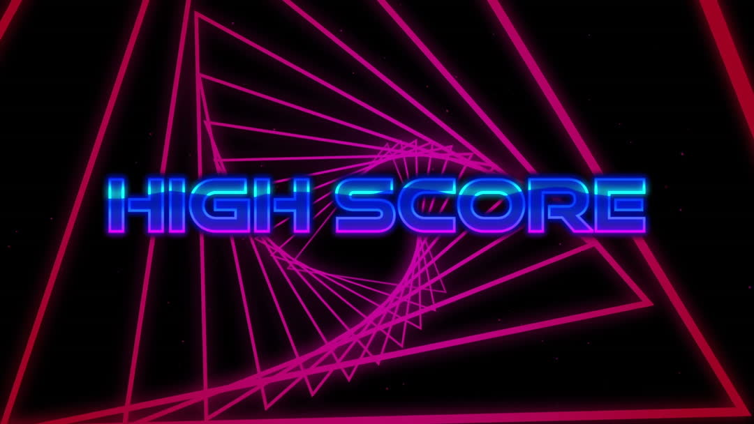 Neon text 'HIGH SCORE' glowing in middle of animated geometric neon triangle tunnel. Evokes retro video gaming with 80s aesthetic. Ideal for enhancing video game promotional material, TV and web content focused on gaming themes, or demonstrating digital graphics in creative design showcases.