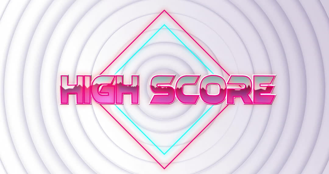 Neon retro high score text prominently featured over a background with concentric circles and glowing digital elements. Suitable for gaming channel art, gaming event graphics, or digital interfaces, capturing a vibrant and nostalgic digital theme.