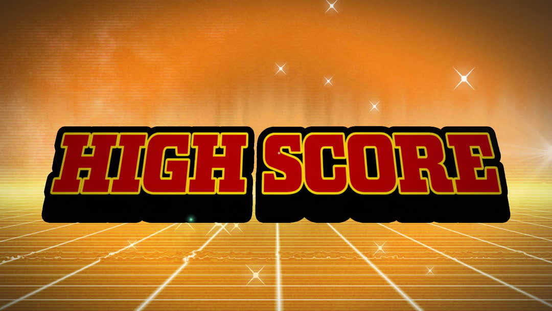 Features a bold and vibrant 'High Score' text animation set amid a retro grid and neon-inspired background, highlighted by glowing stars. Ideal for use in vintage gaming presentations, 80s themed events, or digital content needing a nostalgic throwback aesthetic.