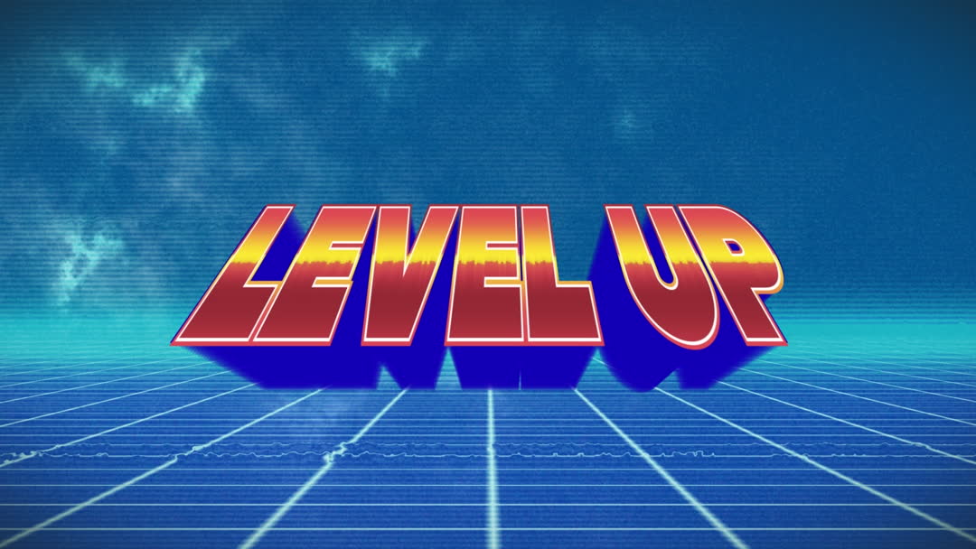 This retro-themed design features 'Level Up' in bold, 80s-style fonts set against a blue digital grid background. Evokes nostalgia and excitement, ideal for use in marketing promotions for video games, entertainment events, and gaming tournaments. Perfect for digital and print media aimed at gaming enthusiasts.
