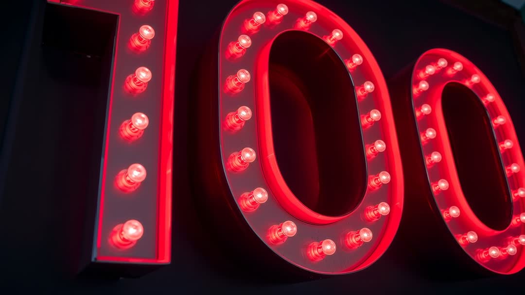 - Retro Marquee '100' Illuminated with Red Bulbs Close-Up Cinematic Pan Video Clip
