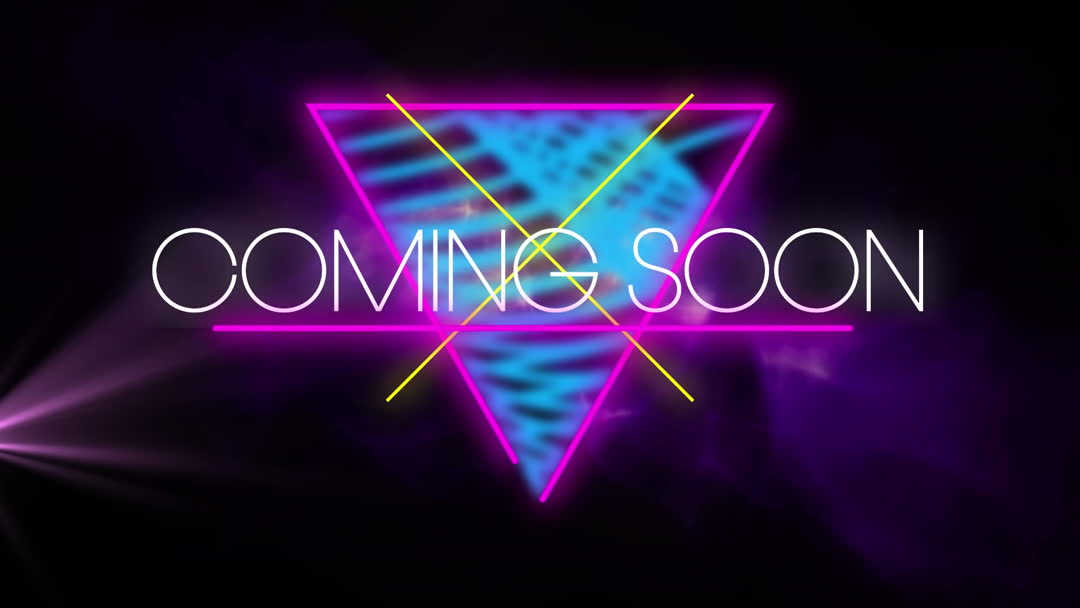 Digital graphic featuring 'Coming Soon' text in neon lettering with a purple and pink triangle design, evoking an 80s retro aesthetic. This video is ideal for marketing campaigns, event promotions, and website launch teasers where a vibrant, eye-catching visual is needed.