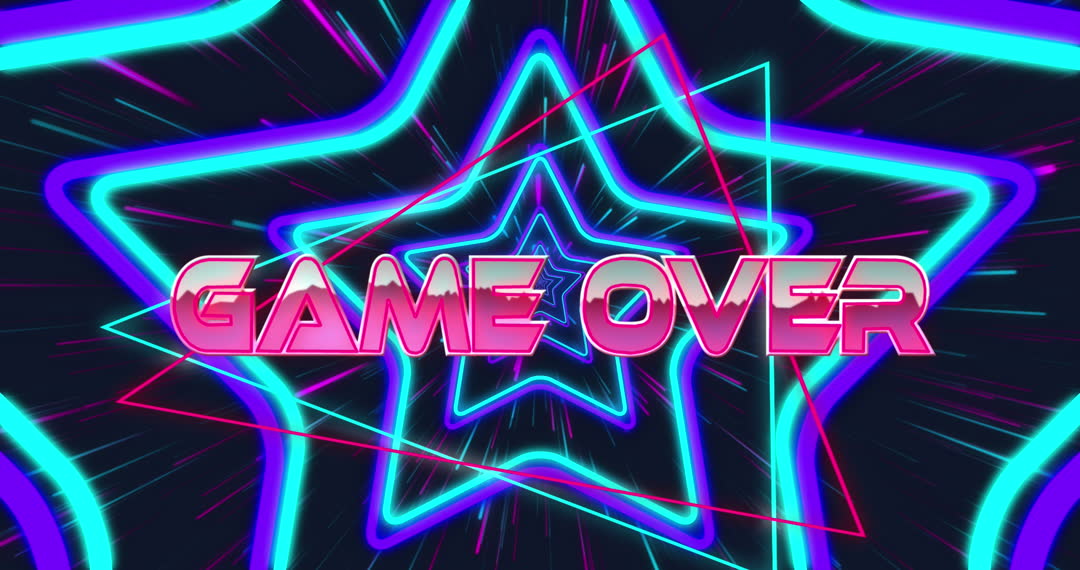 Neon game over animation features a vibrant and colorful backdrop with glowing star shapes. Ideal for use in retro-themed video games, arcade-style apps, digital interfaces, or social media posts. Captivates audiences with its bold typography and futuristic feel, perfect for game ending sequences or humorous fail screens.