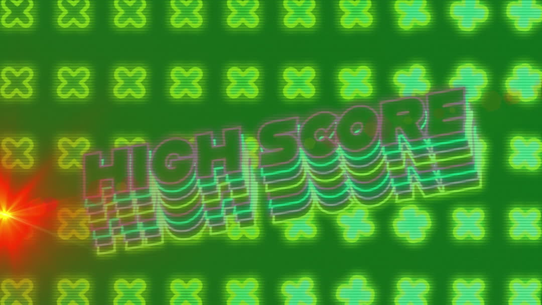 This dynamic background features the text 'High Score' in a retro neon style with vibrant colors and geometric elements. Thanks to its nostalgic and energetic arcade aesthetic, it is perfect for use in digital media designs, video editing, animation projects, or tech-themed presentations. The bold and vibrant elements make it eye-catching for engaging social media content or gaming related video intros.