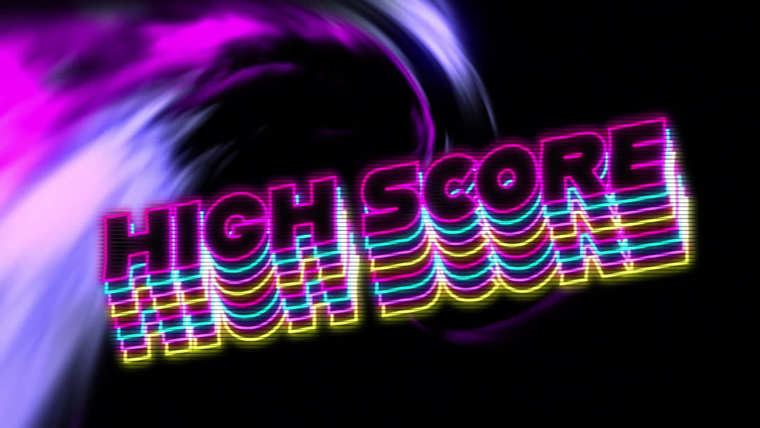 This design features the words 'High Score' in a vibrant neon-style accented by purple light trails against a black background. Its retro-futuristic aesthetic captures the essence of arcade and video game culture. Ideal for use as a gaming event poster, social media banner, or digital design project, showcasing the energy and excitement of competitive gaming.