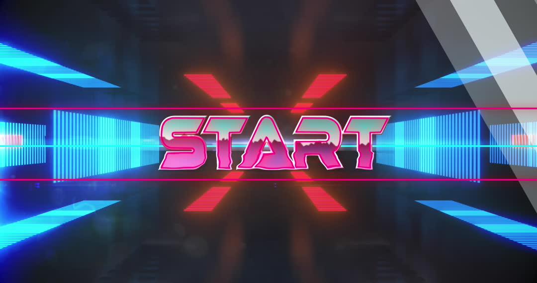 Exciting digital design featuring vibrant neon colors framing 'Start', ideally for promoting action or retro-themed video games. Perfect for use in tech-related presentations, marketing materials for online gaming events, or any digital media requiring a futuristic touch with a nostalgic 80s vibe.