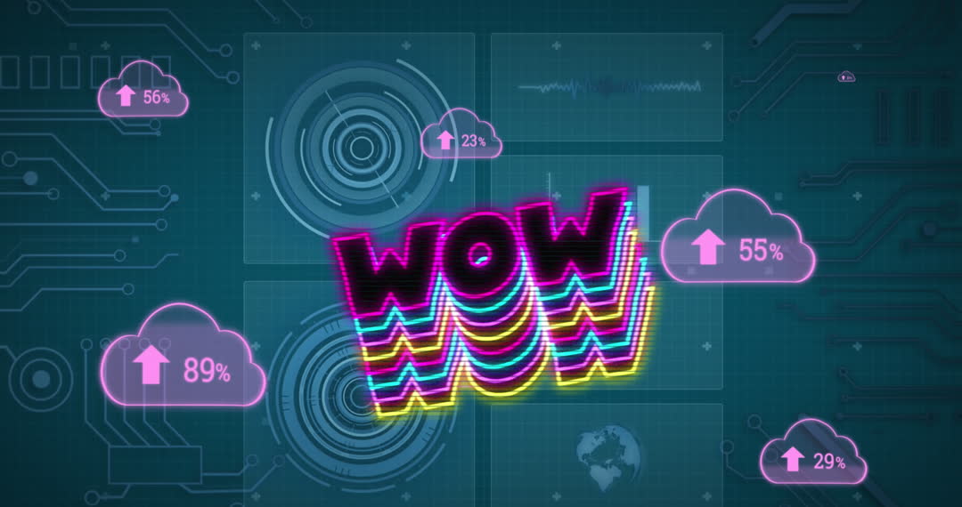 - Retro Neon Wow Text with Data Infographics on Tech Background
