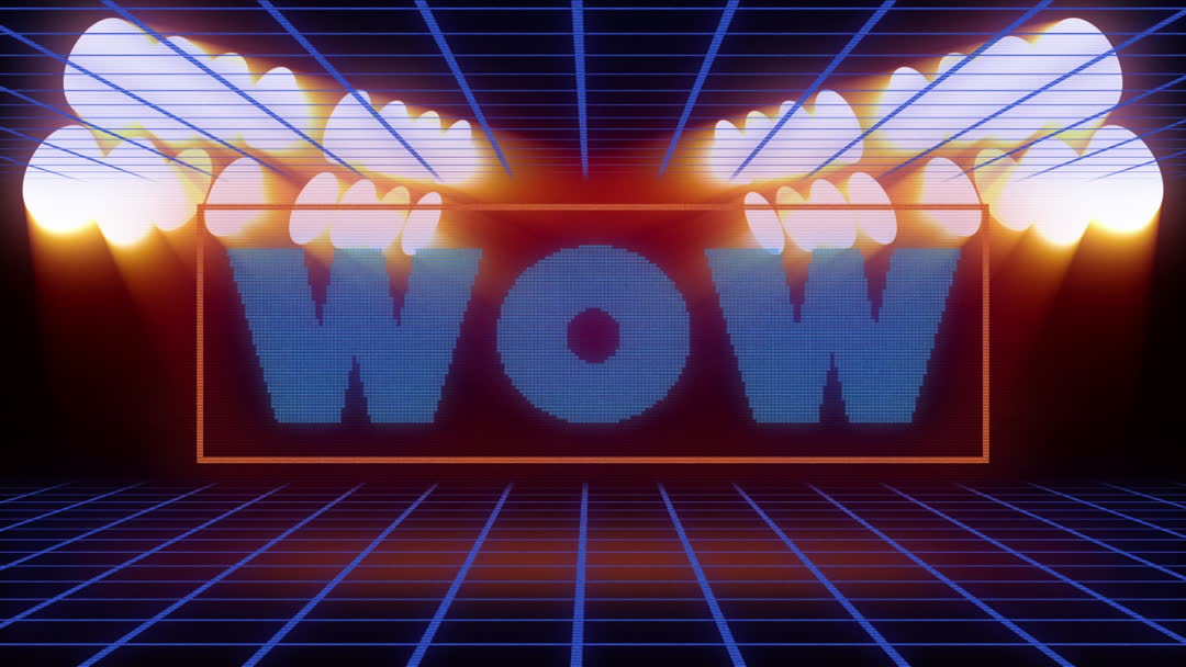 Bold 'WOW' text in neon style against a vibrant digital grid with spotlight effects creating an engaging visual reminiscent of 1980s aesthetics. Suitable for use in technology-related content, digital art themes, social media posts, marketing materials, and event graphics to evoke feelings of excitement and nostalgia.