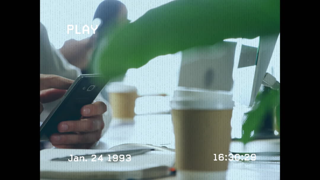 Capture of person using a smartphone at a desk with retro video interference effect. Features a leafy plant, paper coffee cup and bureau setup hinting at technological evolution from early 90s to present. Valuable for projects on digital evolution, retro aesthetics, nostalgia or time travel stories.