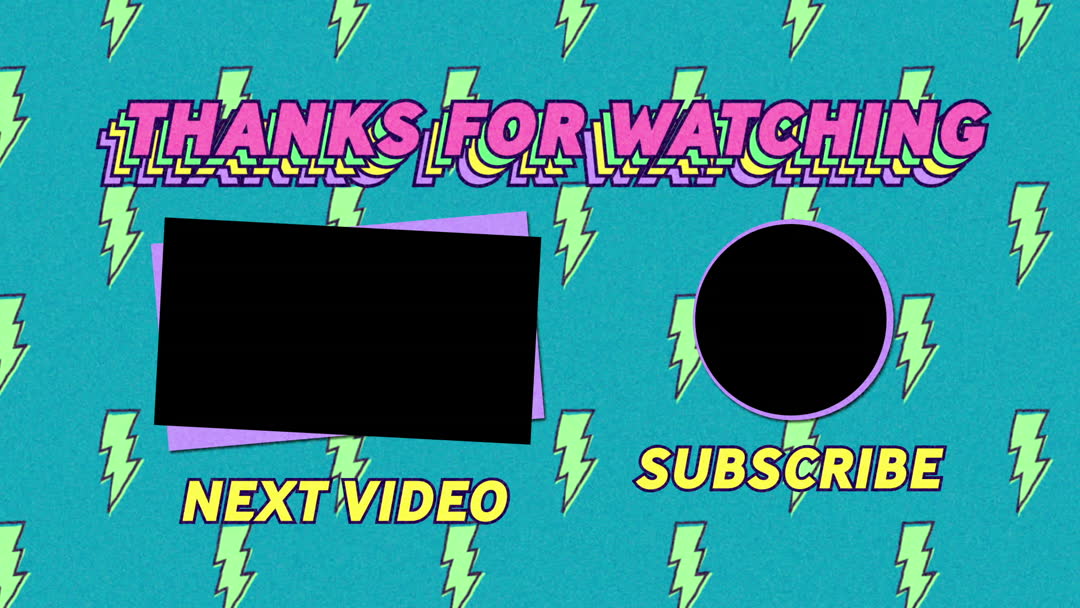 Ideal for YouTube creators emphasizing retro aesthetics, this vibrant end screen captures viewers' attention with bold colors and dynamic lightning bolt pattern. Encourages engagement, perfect for content creators looking to boost subscriptions and funnel viewers to more videos.