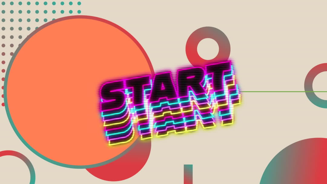 Features vibrant, retro 'START' animation overlaid on bold geometric shapes. Ideal for digital content, gaming overlays, or entertainment promotions, offering a nostalgic 80s visual.
