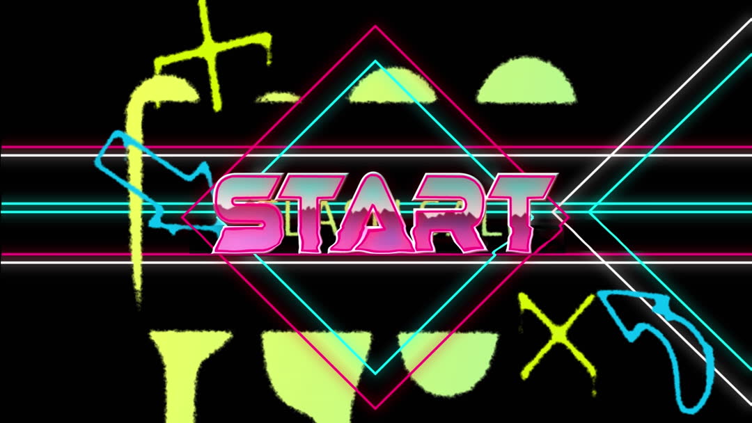 Glowing start screen featuring neon-colored geometric designs against black background, ideal for digital marketing campaigns, social media graphics, vintage gaming-themed presentations, or creative projects requiring a retro aesthetic.
