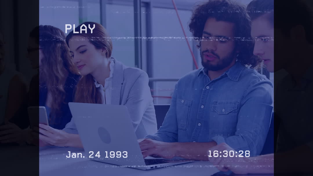 This depicts a diverse group of professionals engrossed in their tasks using laptops, with a retro interference overlay giving it a 1990s videocassette appearance. Great for illustrating themes of teamwork, technology adaption, vintage aesthetics in modern creativity, or portraying a global business concept combining past and present.