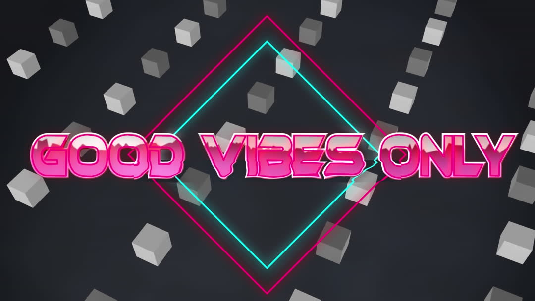 Bold, neon text displays 'Good Vibes Only' over dynamic geometric shapes. Suitable for motivational video content, social media design, and digital promotional materials. Eye-catching vibrant colors enhance positivity and engagement.