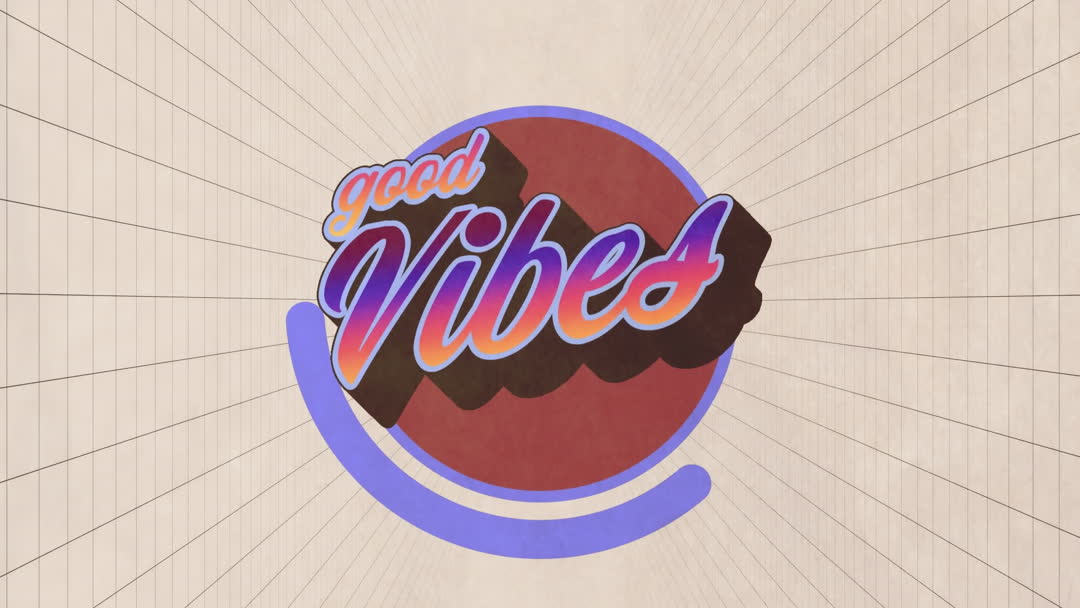 Vibrant and energetic 'good vibes' design with retro typography creates nostalgic atmosphere perfect for 1970s-themed videos, social media graphics, and promotional materials. Use to inspire positivity and capture attention in marketing or inspirational content.