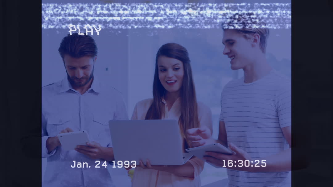 This visual showcases a diverse group of business professionals engaged in technological work with laptops and tablets, layered with a digital distortion effect mimicking an old VCR playback. It indicates international or technology-themed projects, the evolution of technology in business, or multimedia presentations exploring digital media history. Perfect for use in vintage visual edits, multimedia documentaries, or presentations focused on tech advancements and teamwork.