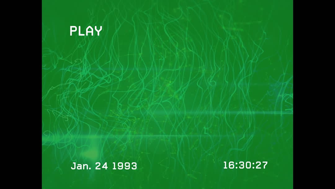 Retro VHS style overlay creates nostalgic ambiance with green light trails and digital interference patterns. Captures fascination with 1990s aesthetics and technology. Ideal for use in creative projects emphasizing retro themes, digital designs, or music video backgrounds evoking a vintage feel.