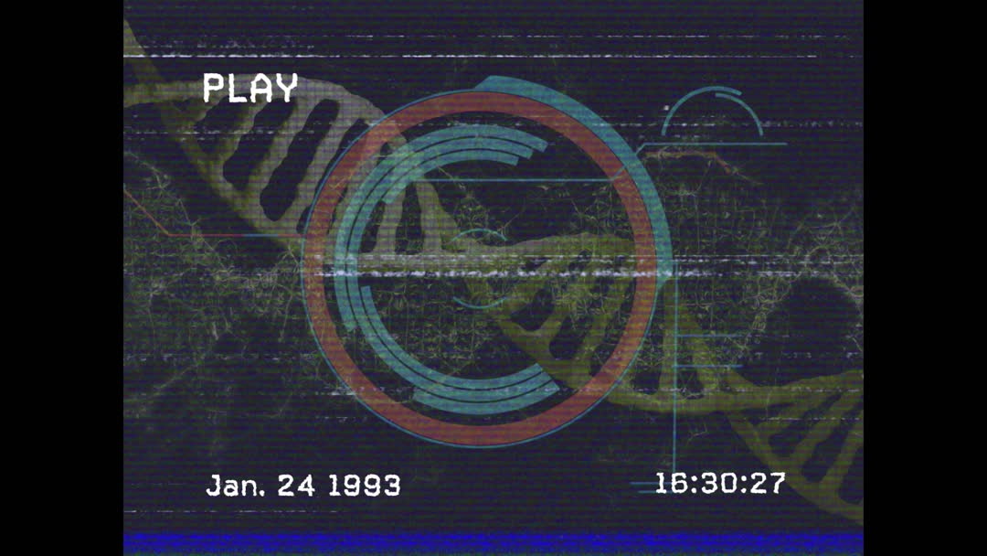 VHS glitch effects pair with a digital display featuring DNA videory and data circles, evoking 90s nostalgia and advanced technology. Suitable for media production involving retro themes or illustrating concepts of biological data security, digital science fiction, or simulation environments.