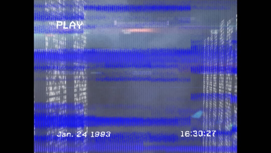 Retro VHS overlay featuring blue static and glitch effects with a financial theme. This nostalgic design presents digital display quirks akin to an old videotape. The addition of a timestamp and 'Play' icon accentuates the vintage feel. Ideal for use in media related to nostalgia, technology, and financial history.