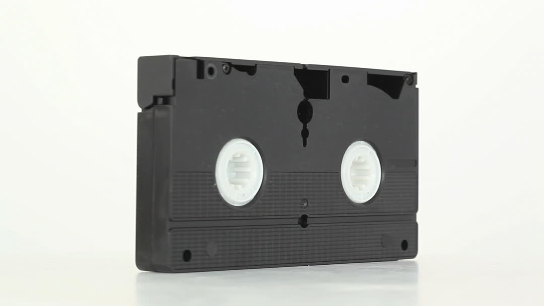 Classic VHS tape slowly spinning showcasing its iconic design against a neutral white background. Perfect for illustrating concepts of nostalgia, retro technology, entertainment history, and media formats. Ideal for use in blogs, documentaries, or presentations related to vintage media and the evolution of video technology.