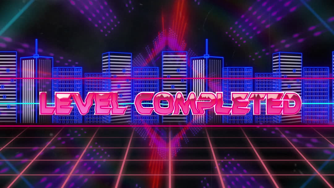 Retro-inspired neon text 'Level Complete' over futuristic cityscape evokes classic video game aesthetics. Useful for gaming content, digital art themes, or nostalgic entertainment projects.