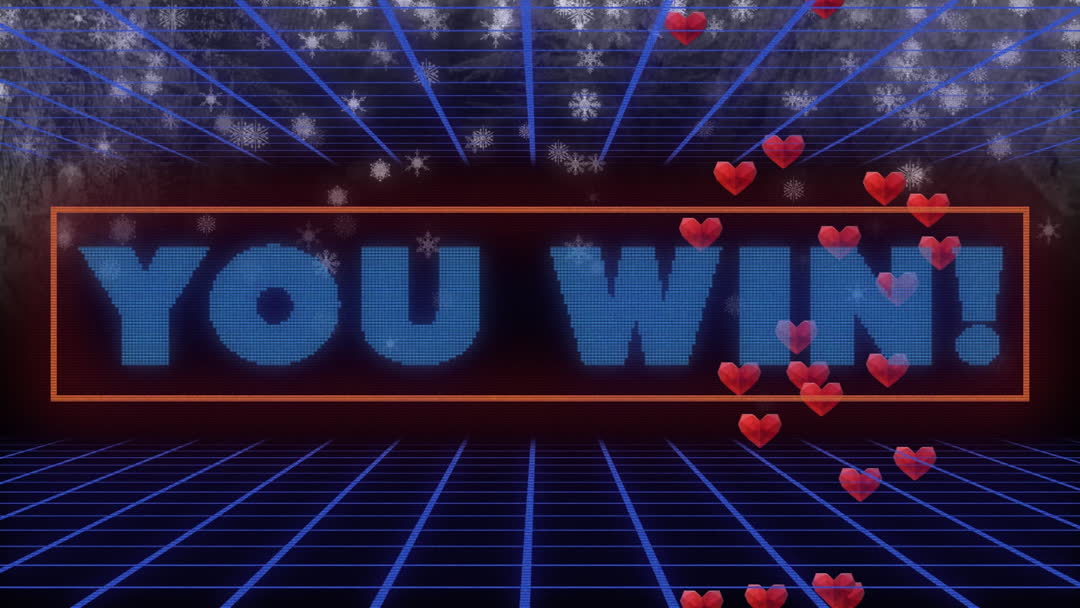 Retro-inspired text displays 'You Win' overlaid on a vibrant neon grid background. Animated snowflakes gracefully fall, complemented by jubilant hearts floating in celebration of victory. Perfect for digital assets, video game endings, animation themes, and festive promotional materials.