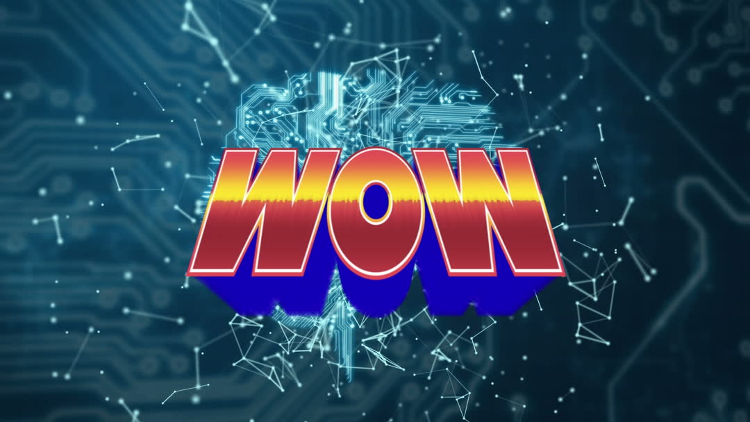 Retro WOW Graphic Against Futuristic Tech Background Video