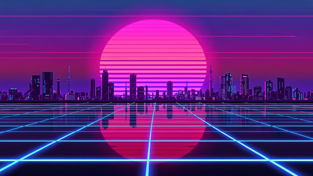 - Retrofuturistic Synthwave Cityscape Loop with Pulsing Pink Sun and Neon Grid Reflection