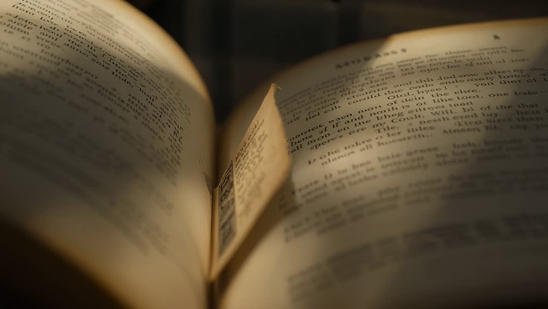 - Revealing antique book pages under warm lamp, turning bookmark, shallow focus