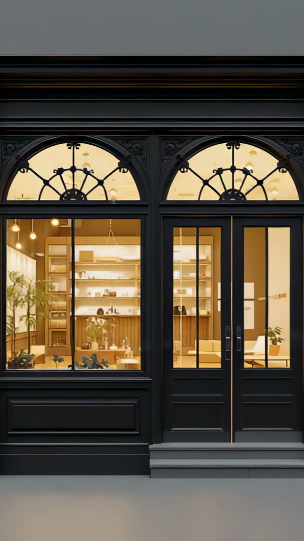 AI Generated Image. Vertical video showing camera push revealing boutique storefront on sidewalk during warm evening light. Interior glow through arched windows featuring lit shelves, curated merchandise, modern seating, potted plants, and seated staff at counter. Ornate black facade and glass double doors creating upscale urban character and cozy mood. Use for retail branding, store opening promos, social media vertical ads, website hero reels, interior design showcases, and location scouting reels. Ideal as B-roll for commercial spots, lifestyle vignettes, and cinematic montages. Suggested editing: slow push-in, warm color grade, soft ambient soundtrack, and subtle title overlays for promo use.