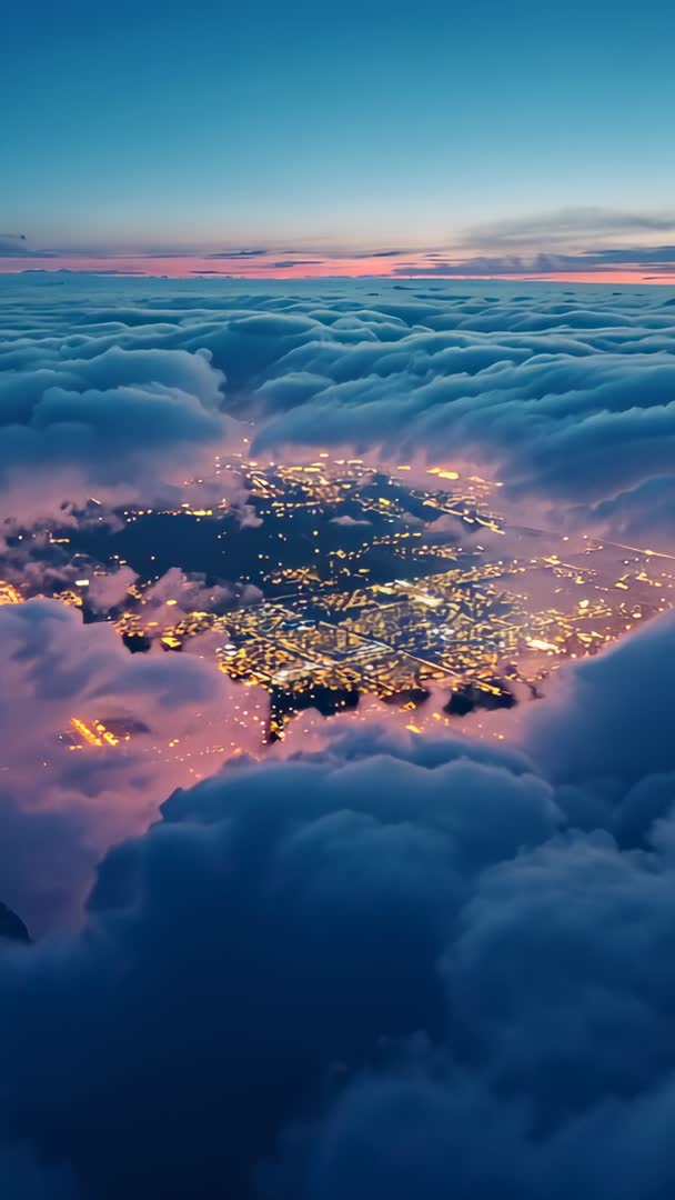 AI Generated Image. Vertical aerial footage revealing city lights through circular opening in dense cloud layer at twilight. Camera descending toward illuminated streets while fog and mist are swirling, creating cinematic atmosphere and strong depth. Warm street glow contrasting with cool blue sky, offering dramatic color palette for storytelling. Ideal for social media stories, mobile vertical ads, travel and tourism promos, urban exploration reels, broadcast openers, and sci-fi or futuristic sequences. Useful for weather segments, time-lapse transitions, and background for titles or lower thirds. Providing room for color grading and slow zoom or parallax edits, enhancing immersive effect.