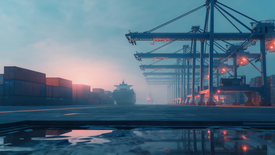 AI Generated Image. Video showing quay at dawn with gantry cranes lining waterfront and container ship approaching. Camera moving forward and upward, revealing expanding container yard, stacked shipping containers, illuminated crane cabins glowing with warm light. Fog and soft sunrise light creating atmospheric mood while wet pavement producing mirrored reflections. Suitable for website hero banners, logistics presentations, shipping and maritime websites, corporate annual reports, trade magazine openers, promotional reels, and transport industry case studies. Ideal for illustrating global trade, port operations, freight movement, supply chain flow, infrastructure projects, nighttime-to-dawn transitions. Editing suggestions: apply slow ambient soundtrack, add lower-third text overlays, include animated data graphics showing throughput or route maps, color-grade for cinematic teal-orange contrast. Technical notes: wide cinematic aspect, low-angle tracking shot, moody lighting, strong reflections, high visual depth.