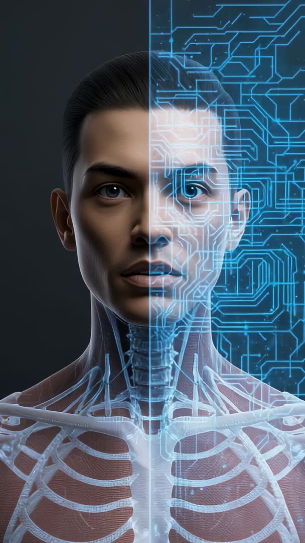 AI Generated Image. Showing half-human face seamlessly merging with glowing circuit network and translucent skeletal anatomy, creating striking contrast between biological structure and digital systems. Visual language featuring cool blue circuitry, high-contrast skin tones, and precise anatomical layering, producing cinematic futuristic mood. Using for tech product promos, AI and biotech presentations, medical education visuals, sci-fi film intros, startup pitch decks, mobile ad creatives, social vertical stories and app splash screens. Suggesting edits: adding animated data lines and particle effects, applying subtle glitch transitions, pairing with ambient electronic soundtrack, overlaying bold sans-serif titles and short explanatory captions. Delivered in vertical 9:16 format, optimized for mobile platforms such as Instagram Stories, Reels, TikTok and Snapchat, and adaptable for website hero sections, trade show screens and educational e-learning modules.