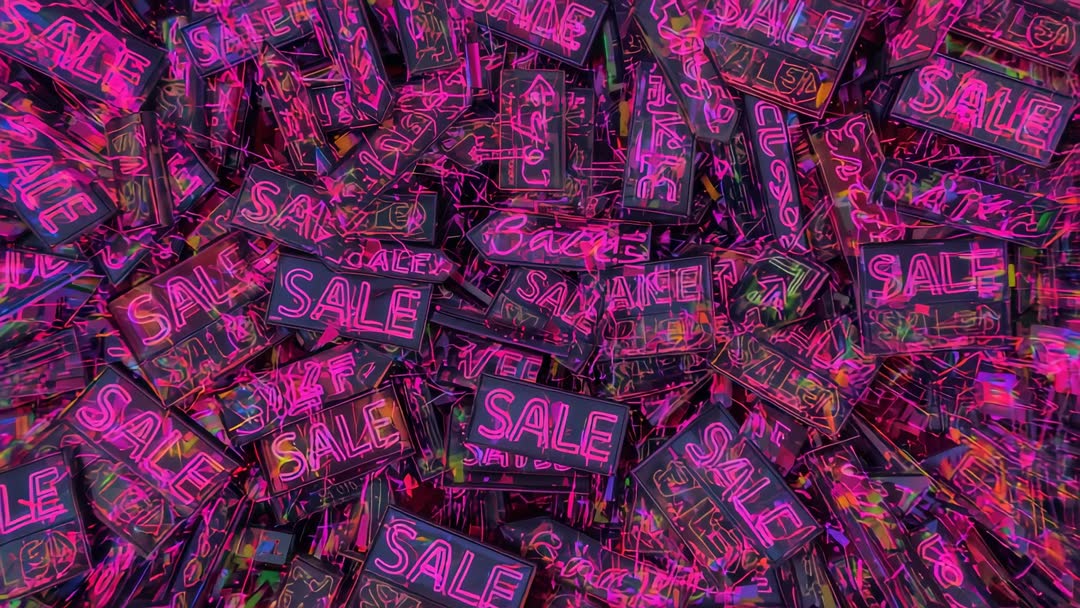 AI Generated Image. Vibrant looping video showing dense cluster of SALE neon signs pulsing magenta glow and revealing layered neon tubing. Perfect for retail promotion backgrounds, online sale announcements, store window displays, countdown timers, social media ads, digital signage, and e-commerce hero headers. Suitable for TV bumpers, nightclub visuals, fashion campaigns, and cyberpunk-themed motion graphics. Easy to loop and crop for multiple aspect ratios while maintaining strong center composition. Pairing with bold typography, animated overlays, and upbeat soundtracks for maximum impact. Supplying high-contrast neon palette for color grading and brand customization.