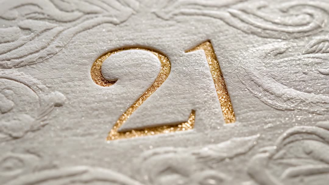 AI Generated Image. Showing extreme close-up video clip of embossed gold foil numeral 21 recessed into textured cream paper, revealing glittering edges as studio light is shifting across surface. Capturing shallow depth of field and subtle bokeh from metallic flecks, emphasizing tactile detail and luxury finish. Offering ideal footage for opening title sequences, product packaging reveal, invitation animation, 21st birthday or anniversary promotions, and luxury brand campaigns. Working well as hero background for websites, social posts, digital ads, and print mockups. Suggesting slow lateral pan or reveal wipe to enhance shimmer, using color grading to boost warm gold tones and preserve soft cream texture. Including room for overlay text or logo in blurred areas, and providing seamless loop potential for elegant motion backgrounds.