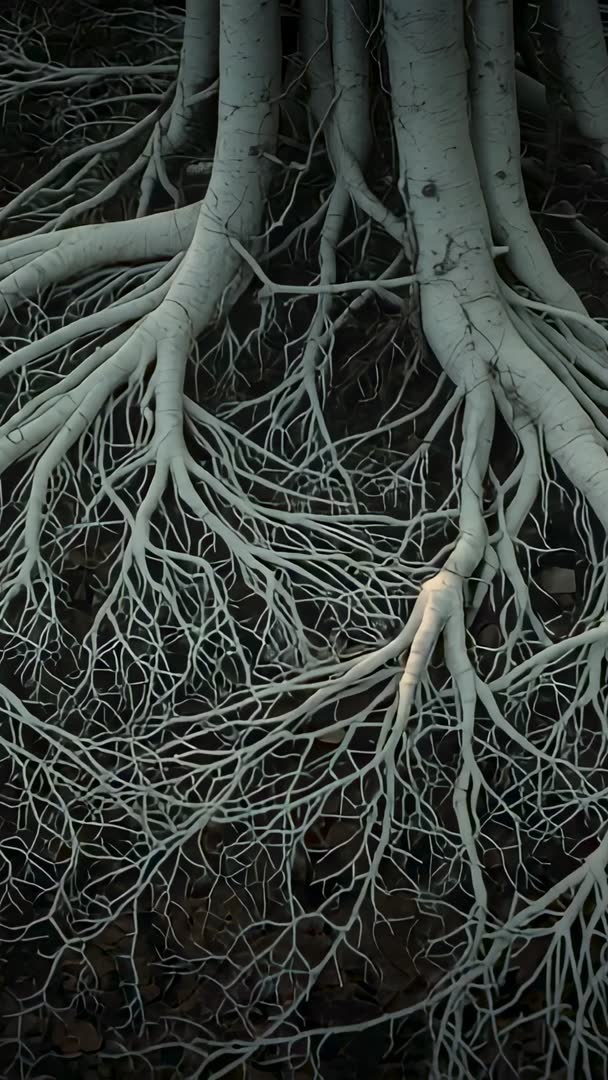 AI Generated Image. Shifting camera revealing exposed roots at tree base, highlighting intricate fibrous tendrils and layered soil. Emphasizing organic texture, radial root architecture and tangled natural pattern for dramatic closeup study. Suiting nature documentaries, environmental campaigns, botanical education and science explainer videos. Optimizing vertical composition for mobile viewing on social platforms, Instagram Stories and TikTok reels. Working well as ambient background for meditation, wellness videos, music visuals or title sequences for outdoor and conservation projects. Pairing with ambient soundscape or voiceover for immersive narrative, adding slow zoom or crossfade transitions for seamless editing.