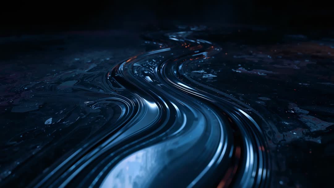AI Generated Image. Abstract video showcasing glossy S-shaped metallic ribbon flowing across dark reflective surface with subtle amber highlights. Cinematic low-angle camera movement revealing depth and fluid motion, creating hypnotic visual rhythm. Suited for tech branding, interface backgrounds, corporate presentations, music visuals, motion graphics, website hero banners. Works well as looping background for product launches, advertising campaigns, social media reels. High contrast moody color palette offering modern futuristic aesthetic and space for overlaying text or logos. Useful for editorials on AI, materials science, digital art, and concept design.