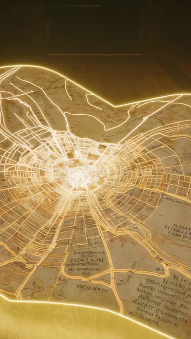 AI Generated Image. Showing glowing core radiating golden lines across aged parchment map, revealing radial street network and handwritten cartographic text. Serving historical documentary openers, heritage travel promos, game cinematic intros, museum exhibit loops, and book trailers. Working well as vertical video for mobile advertising, social media reels, app splash screens, and title sequences, allowing easy placement of overlaid titles, logos, and voiceover. Conveying themes of exploration, discovery, navigation, treasure hunt, and ancient cartography, and offering rich visual contrast for color grading and motion graphics.