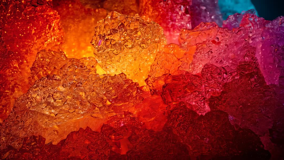 AI Generated Image. Camera revealing translucent faceted crystals glowing from warm amber core while colored lights shift through red, orange and magenta. Macro movement capturing intricate prism textures, light refraction and sparkling surface facets for strong visual depth. High contrast color palette creating dramatic, cinematic mood and rich abstract patterns. Ideal for use in background loops for music videos, title sequences, screensavers, website hero banners, product packaging and promotional reels. Compatible with color grading and motion graphic overlays, enabling easy integration into luxury, beauty, tech and abstract art projects. Supplying high-resolution frames for print or still extraction, plus loop-friendly segments for seamless visual branding. Including ai-generated tag for attribution where required.